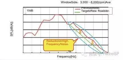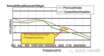 对于Roadster,能够与乘客愉快对话是需要提供的一项重要价值。目标是在长距离行驶中的匀速行驶等场景,保证良好的静音性。具体的开发目标是使刺耳的高频声波要比以往款式减少约40%(Fig.3)。