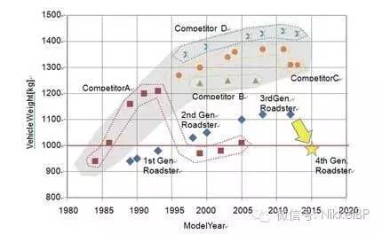 新款Roadster一直把提供“令人着迷的驾驶体验~随时间不断加深的驾乘乐趣”作为商品价值之一来推进开发的。在车辆运动性能方面,以提供由彻底轻量化带来的“得心应手的操控乐趣”为目标;在振动噪声性能方面,要通过声音给人以Light Weight Sports(以下LWS)轻快、线性的印象;目标是要提供令驾驶员总想踩下油门的驾驶体验。在彻底轻量化方面,与最轻型款式,也即初代Roadster同样低于1,000kg为目标,比之前车型减轻了100kg以上。另外,为了既要实现LWS,又要去除恼人的噪声,隔音材料也需要进行优化配置。为此,我们通过确定隔音效果好的部位,采用重量效率高的材料等,探讨了既能实现轻量化,又能维持并提高性能的方法。在车辆总共减轻的100kg以上重量里,与隔音性相关的部件约占8~12kg,在维持、提高隔音性能的同时,实现了LWS的轻快感与悦耳的声音。