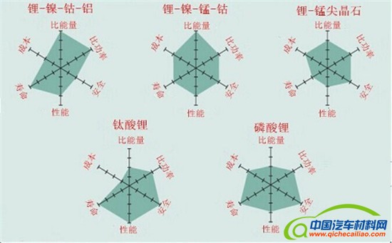 图1比较了5种电池在安全性、比能量(也称为容量)、比功率(电池的大倍率充放电的能力)、电池的高低温性能、寿命(包括使用寿命和储存寿命)以及成本6个指标的性能。但图中没有提及充电时间,如果有合适的电源插座可用,电动汽车动力系统的所有电池都可以快速充电,超快速充电是个例外情况,不过大多数用户还是能够接受几个小时的充电时间的。图1 也没有列出自放电性能——这是另一个需要重视的电池特性,在一般情况下,锂电池自放电速率较低,如果电池是新的,自放电几乎可以忽略不计。然而,因受热引起的电池的老化会加速电池的自放电并引起电池管理上的问题。在电动汽车可选的电池类型中,磷酸锂电池比其他电池系统自放电速率都高。