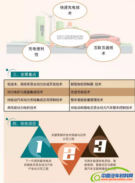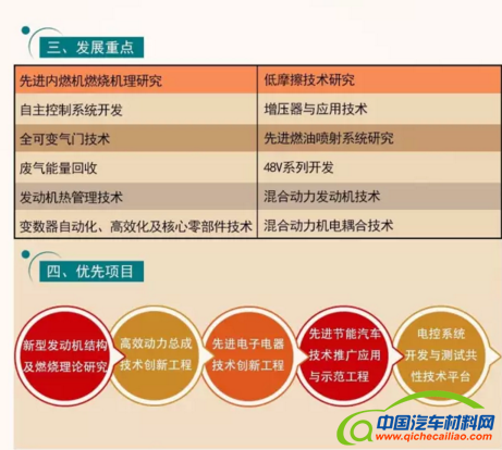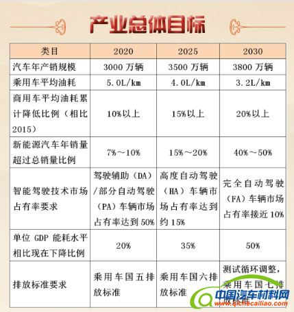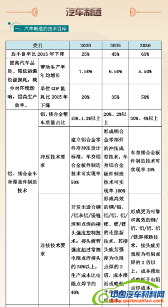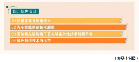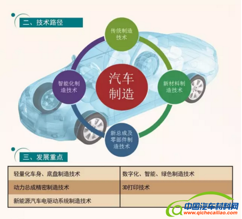 在汽车制造方面,以绿色制造、降低损耗为发展目标,要求车身材料以铝、镁、碳纤维复合材料为重点,同时,优化新能源汽车动力总成,大力发展智能制造技术。