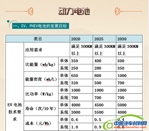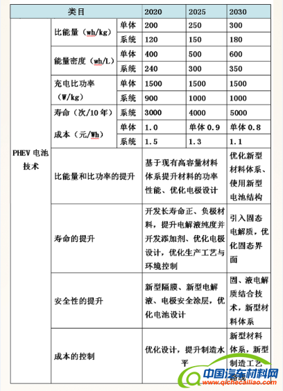 在动力电池方面,对EV、PHEV电池的能量密度、比功率、寿命和成本均给出了相关参考数据,要求未来10年内优化现有锂离子动力电池技术,开发新型锂离子动力电池为重点,未来15年内持续优化新型锂离子电池,在保证安全性前提下提高动力电池的能量密度,建立实用化和规模化应用。