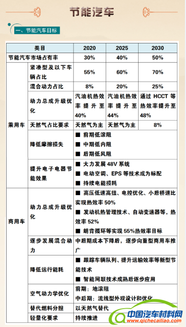 按照产品划分,《路线图》以节能汽车、新能源汽车、智能网联汽车三个方向,要求技术向低碳化、信息化、智能化趋势发展。在节能汽车方面。对乘用汽车、商用车汽车平均油耗提出三个阶段的要求;加快紧凑型及以下小型车的推广,提高占比;以混合动机技术为重点,发展天气燃气车辆为方向,优化动力总成,全面提升传统燃油汽车节能技术和燃油经济水平。