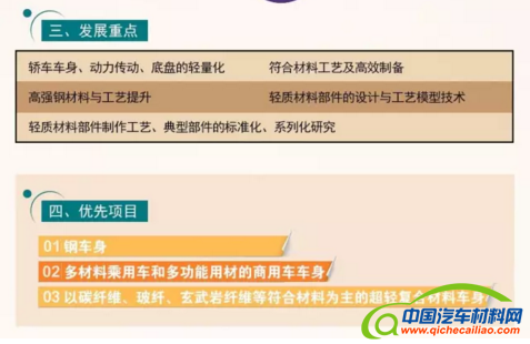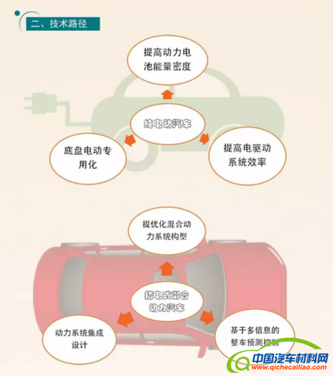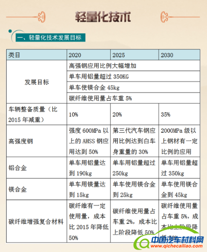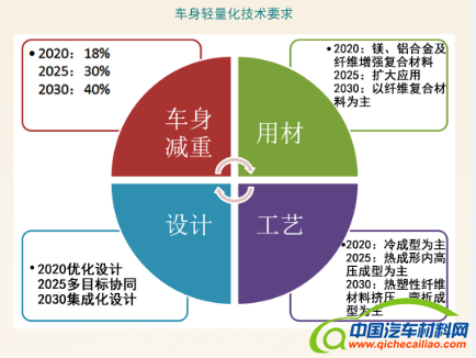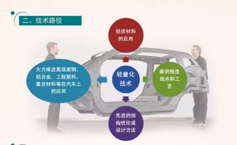 在轻量化技术方面, 从整车使用的轻量化材料提出要求,对铝合金、镁合金、碳纤维增强复合材料的用量给出不同阶段的参考数据。同时,在车身设计、工艺上提出了具体要求,如车身设计要结合材料、性能等多目标协同,把工艺和成本控制结合进行,车身工艺从冷成型、热成型到热塑性纤维材料成形的方式发展。