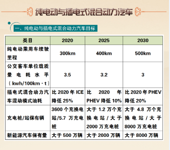 (一)在纯电动与插电式混合动力汽车类目中,《路线图》对新能源汽车年销量与汽车年销总量占比、充电桩/站保有量、纯电动乘用车续航里程、插电式混合动力汽车混动模式油耗等提出三个阶段的目标。要求纯电动乘用车以中型及以下车型规模化发展,插电式混合动力乘用车以紧凑型及上车型规模化发展;