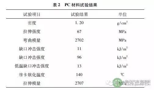 本次研究样品以后风挡为对象,塑料后风挡以PC( 聚碳酸酯) 改性材料作为原材料. 原材料性能测试结果见表2.