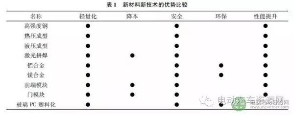 随着国内外电动汽车的发展,其他轻量化新材料和新技术的应用也逐渐多了起来并趋于成熟( 见表1) . 目前我们重点关注的技术有: