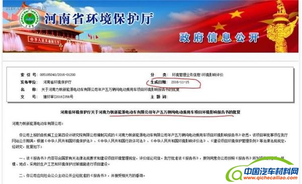 2016年11月15日,河南省环保厅发布《关于河南力帆新能源电动车有限公司年产五万辆纯电动乘用车项目环境影响报告书的批复》的公告。