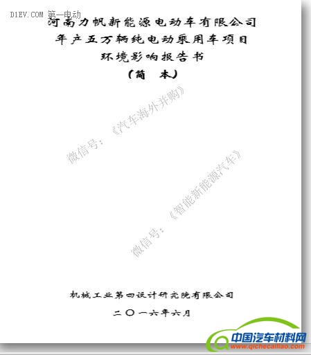 河南力帆新能源电动车有限公司的环评报告显示,该项目总投资9.383467亿元人民币,计划建设年产能5万台的纯电动乘用车,包括1.25万辆力帆330EV电动车,1.25万辆力帆630EV电动车和2.5万辆力帆820EV电动车。