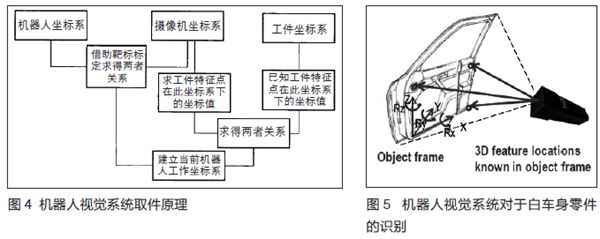 视觉引导系统是协同工业机器人作业的一种传感装置,连接了机器人、抓手和外部设备等,取件原理如图4所示。在整个设备工作中,视觉引导系统拍摄当前到位工件的状态计算出目标物体的位置信息,并矫正机器人坐标系或工具坐标系,直到工具与工件之间的相对位置与示教的状态完全相符。机器人坐标系、摄像机坐标系和工件坐标系之间的关系如图5所示。机器人视觉引导上料工位典型布局如图6所示。