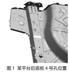 同一平台车型的下车体零件往往相似或相同,如前纵梁、中底板和后底板等零件,使得底部工装可以共用,使得工艺主线上的工装复杂程度降低。如图1所示,某平台上后底板上设置了两个4号定位孔,该平台下的短轴车型使用靠前的4号孔,长轴车型使用靠后的4号孔,使得该平台下不同长度的车型不仅共用后底板零件,还可以共用4号孔定位销。