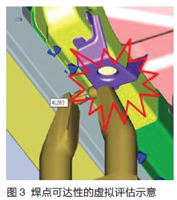 要满足多车型共线,必须验证产品设计的可行性。从虚拟评估内容上看,柔性白车身生产线制造是一个复杂的系统工程,集成了电阻点焊、涂胶、折边、激光焊接、螺柱焊接和螺母焊接等,其相关设备工艺的独特性直接影响产品开发的可制造性,设备工艺和产品设计的相容性是主要评估内容。例如,电阻点焊的可达性就是重要的评估内容之一,仿真工程师根据工艺过程在虚拟环境中载入产品数模和工具数模,通过焊枪运动仿真,判断是否所有焊点均可达(见图3)。