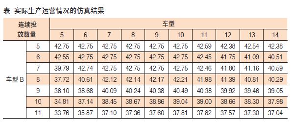 假设某工厂主线为A车型和B车型共线,主线产能为42JPH。侧围内板线为独立的两个单元,A车型侧围内板分拼线产能27 JPH,B车型侧围内板分拼线产能22 JPH,A车型和B车型的EMS分岔线上各有6个EMS小车停车位作为缓冲,通过两个上料口为主线供料。通过以上条件作为仿真输入,可以得到的仿真结果如表所示。例如,连续投放A车型11辆后,再连续投放8辆B车型,则主线节拍最高可达到41.98 JPH,无法满足主线42 JPH的生产节拍要求。