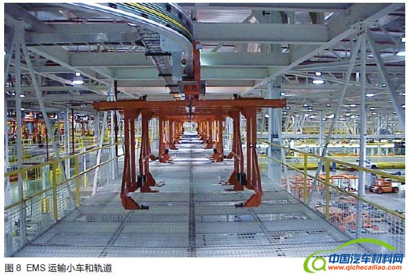 焊装车间除了主装配线外,还有若干分拼区域,例如内外侧围、前后厢盖和车门等。其中,内外侧围至主线的传输一般使用EMS循环小车,通过机器人或升降机将总成挂到EMS小车的支架上,通过循环的单轨集成电刷轨道将总成运送至主线(见图8)。相比其他传输方式,EMS小车传送速度快,支持多车型共线,可以根据主线的车型分配进行配比。但是在柔性生产线的规划过程中,通常是若干条分拼线支持一条主线,分拼区域的生产节拍要低于主线区域,因此如果连续生产某一车型,会存在分拼线无法供给主线需求的情况,为此需要通过结合分拼节拍、主线节拍、EMS小车数量和缓冲空间等作为输入,模拟生产状况,得出合理的配比。
