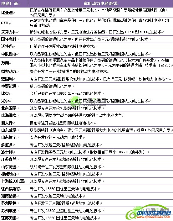 中国新能源汽车市场上主要动力电池厂商的电池路线情况见表3: