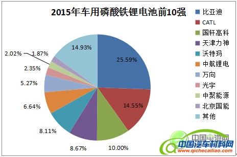 图3. 2015年中国车用磷酸铁锂动力电池市场前10强(注:指电芯企业)(数据来源:真锂研究,2016年8月20日)