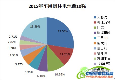 图7. 2015年中国车用圆柱动力电池市场前10强(注:指电芯企业)(数据来源:真锂研究,2016年8月20日)