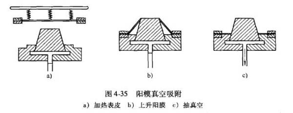 阳模真空成型与阴模真空成型法一样,模腔壁贴合的一面质量较高,结构上也比较鲜明细致。壁厚的最大部位在阳模的顶部,而最薄部位在阳模侧面与底面的交界区,该部位也是最后成型的部位,制品侧面常会出现牵伸和冷却的条纹,造成条纹的原因在于片材各部分贴合模面的时候有先有后之分