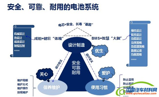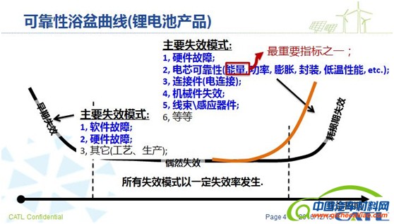 在保障电池可靠性方面,CATL从系统层层分解,从最小零部件,逐层去分析失效模式和失效率。根据失效率的“浴盆曲线”模型,所有的产品在早期失效率会比较高,使用中期失效率会下降,到晚期老化时又会升高。CATL作为电池厂家,尽力把产品的早期失效控制在出厂前,使用户在使用期间的失效率降到最低,在老化衰老期失效率增加时,电池系统依靠诊断、预测,指导维护使用,最终使动力电池寿命达到最高。