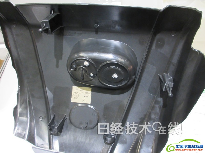 京都大学首次展出了利用按重量计算添加有5%CNF的聚酰胺(PA)制成的发动机罩。将CNF作为强化材料混入树脂中,可以制成轻量、高强度的CNF强化树脂。使用这种树脂,3倍发泡成型的是新型CNF强化树脂发动机罩。特点是重量只有大约600g。而用按重量计算混有30%玻璃纤维的玻璃纤维强化PA制造的传统发动机罩重约900g。也就是说,通过使用CNF,发动机罩减轻了约3成。
