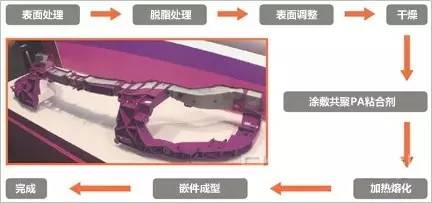 接下来将带有共聚PA粘合剂膜的铝合金放入模具,射出PA进行嵌件成型,前端模块就完成了。成本与之前基本相同。因为省去了用螺丝连接金属框架和树脂部件的成本等。