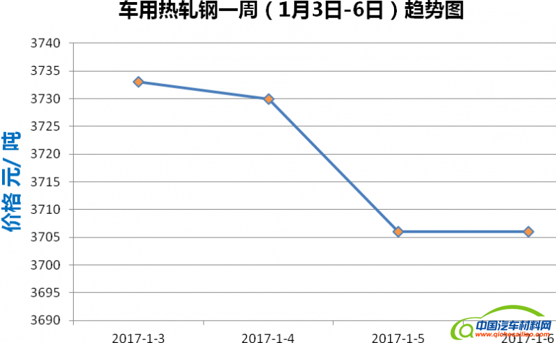 热轧钢本周内价格整体变化较大:1月3日-5日价格下跌,跌幅达27元/吨,其中4日-5日下跌较明显;1月5日-6日价格恢复平稳,没有较大变化。热轧钢本周均价为3718.8元/吨,较上周上涨0.42%。