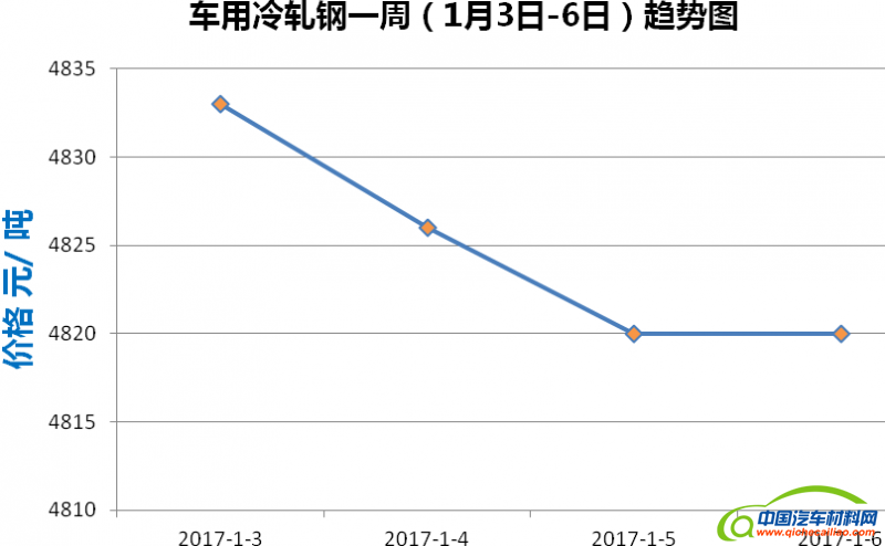 冷轧钢本周价格先下降后趋于平缓。1月3日-5日,价格直线下跌,但跌幅不大,仅为13元/吨;1月5日-6日,价格趋于平稳。冷轧钢本周均价为4824.8元/吨,较上周下跌0.12%。