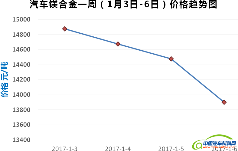 镁合金本周内价格呈持续下跌趋势,一周内跌幅达975元/吨。镁合金本周均价为14481.3元/吨,较上周下跌5.76%