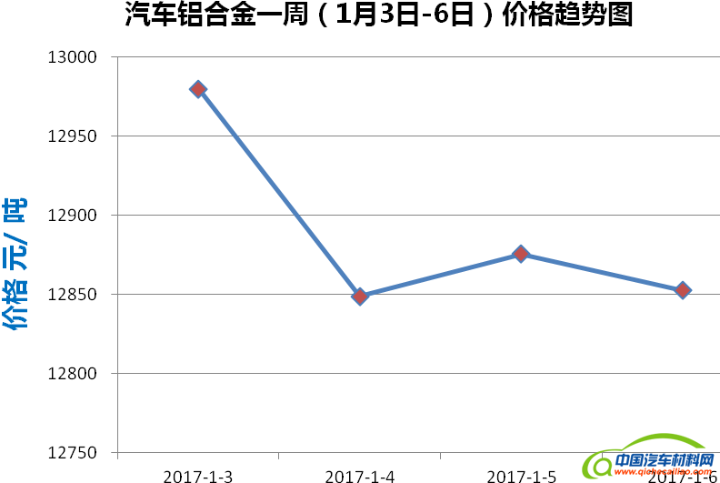铝合金本周内价格波动较大。1月3日-4日,价格快速下跌,跌幅为131元/吨;4日-5日价格略有回升;5日-6日价格再次下跌。铝合金本周均价为12889元/吨,较上周下跌0.13%。