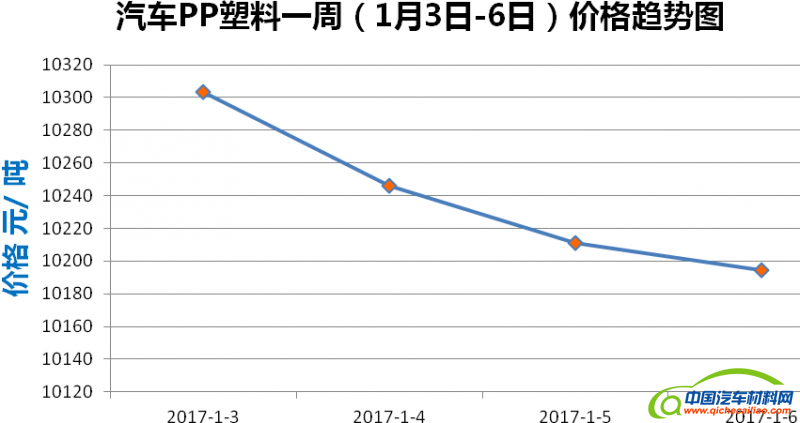 PP塑料本周内价格呈下跌趋势。从1月3日至1月6日持续下跌,跌幅达109.3元/吨,跌速为36.4元/(吨∙天)。PP塑料本周均价为10238.9元/吨,较上周下跌0.36%。