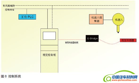 PLC与视觉控制之间采用TCP信息交互,实现多达15种信息的确认反馈及执行,从而实现车型信息的交互及车身状态的信息交互;视觉控制与机器人控制同样采用TCP形式进行信息交互,通过视觉传感器反馈的位置数据,视觉控制进行数据比对,对机器人进行信息传递,从而控制机器人的自动装配;PLC与机器人控制之间则采用Profinet形式进行信息交互,最重要的是,机器人通过此连接确认机器人进入线体的安全状态。