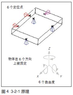 本文采用“3-2-1”定位原则(见图4)进行阐述。当需要完全定位一个物体位置时,需对其6个自由度进行限定,而“3-2-1”定位原则简单地讲就是先通过至少3个点的Z向坐标所拟合出来的型面来限制该物体在Z向的位置和旋转,然后从至少两个点的Y向坐标所拟合出来的直线来限定该物体的Y向位置和旋转,最后通过至少一个点的X向坐标来最终确定物体在X向的平移,从而确定一个物体的位置的定位方法。