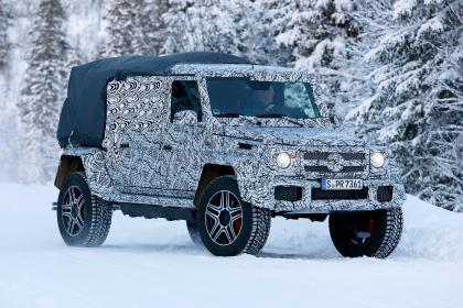 奔驰公司在筹划推出第二代奔驰G500 4×4² SUV,近日有外媒拍摄到该车的全新皮卡版本冬季测试的画面,从捕获的谍照中,我们不难看出该款新车型体型巨大,外观强悍。