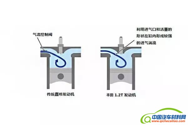丰田1.2T发动机通过调整进气口以及活塞顶的形状,让气缸内的气流更为理想的流动,增强了滚流比。更为充分快速的燃烧过程进一步提高了热效率,减轻了氮氧化物排放。