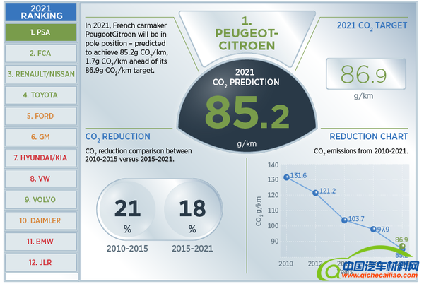 至此,基本上三代塑料尾门的编年史我们就已经捋的差不多了,有些遗漏或者不对的地方,由于信息搜集上的限制没办法做到完美,遗漏之处还请批评指正。再回到排放的话题上来,塑料尾门的开发,就是顺应全球对汽车减少燃油消耗的诉求以及排放法规越趋严格的大势之下,我们可以看到欧洲和日本的厂商对于此项技术比较热衷,搜寻资料的过程中发现一个很有意思的网站,其预测了到2020年,那些主机厂可以达到碳排放标准而那些可能达不到。其中法系的标致和雷诺被看好,日系其次。而德系,美系,韩系则可能达不到目标见图(29)。我们从塑料尾门的开发力度上,也可以说名这一点。从目前的情况看,可以肯定的是未来塑料尾门肯定会越来越普及,SUV和MPV车型,混动和电动车型,都有轻量化的需要来提升油耗,排放或者续航能力,会有越来越多的主机厂去做这样的尝试,我们拭目以待吧。