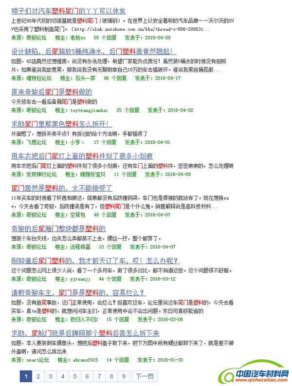 塑料尾门第一次走进大众的视野应该是2014年初,国产奇骏上市之后。你要是在某车之家论坛里搜索“塑料尾门”四个关键字,首页十条检索结果里六条是来自于奇骏论坛,如图1。大家都是一脸“你逗我呢”的懵逼表情看着这个塑料的尾门,千万个不信任。这玩意儿能抗撞?安全吗?会不会一蹭就烂了?坏了怎么修?更多的,大家偷工减料,糊弄中国人的帽子已经扣出去了。日产也是一脸大写的冤,伦家欧洲,本土,北美都是这样的,也没见这么大的反应啊。我想,可能是,我们的钢板崇拜教众都比较虔诚吧。