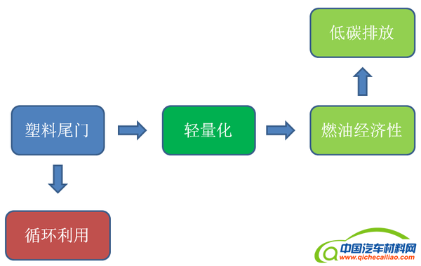 要开始讨论这个问题,我们先要堆砌几个和汽车无关键词:环境保护,低碳社会,可持续发展,和谐自然……你可能会觉得这些词又红又专的感觉,和我们今天要讨论的问题没什么关系啊。那你就错了,这些我们活着从小就耳熟能详的,或近几年才热起来的词语,也是全球当下都关注的话题。毕竟,地球只有一个,汽车作为现代社会最普遍的交通工具,其使用的是化石燃料,不可再生,产生的气体中又有许多对环境有害的成分,自然是全社会关注的焦点。这些焦点对应到汽车上,也是几个关键词:燃油经济性,碳排放,材料回收再利用,能源回收……在对应到细节的技术上,就是发动机技术的发展与创新,新型燃料的应用,混合动力系统的应用,电动车的开发,怠速起停系统,刹车能量回收系统,排放控制技术的发展,材料循环使用,以及轻量化。如果我们简单的画一个路线图,塑料尾门的作用会是这样的。