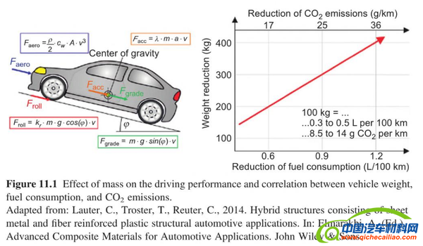 所以说,随着欧美越来越严格的排放法规,诸如欧六法规的实施。而且欧盟在2009年通过了第443号法规,旨在控制CO2的排放,其远期目标是到2020年,CO2排放控制在95 g/km. 面对如此严苛的法规,主机厂自然会使出全身解数去压榨整车各个方面的性能,轻量化也自然成了一个重要的方面。而且根据研究结果,汽车每降重10%,燃油效率能提高6%~8%不等;汽车每降重100kg,CO2排放降低8.5g/km, 如图所示。