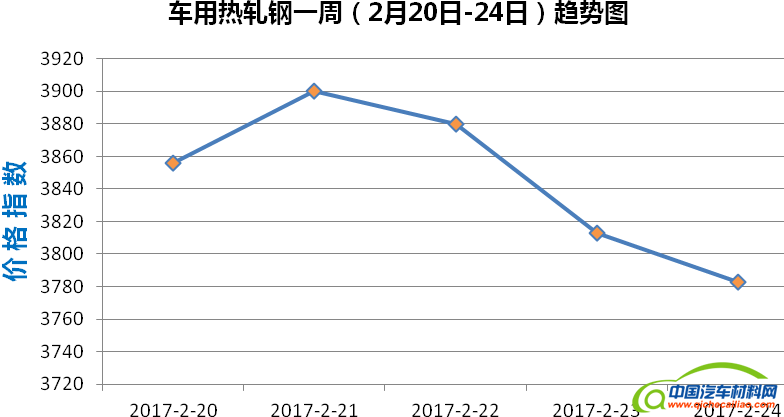 热轧钢本周内价格整体呈下跌趋势,2月20日-21日,价格略有上升;2月21日-24日价格下跌,四天内跌幅达117。车用热轧钢本周平均价格指数为3846.4,较上周0.61%,较1月份均值上涨3.00%。