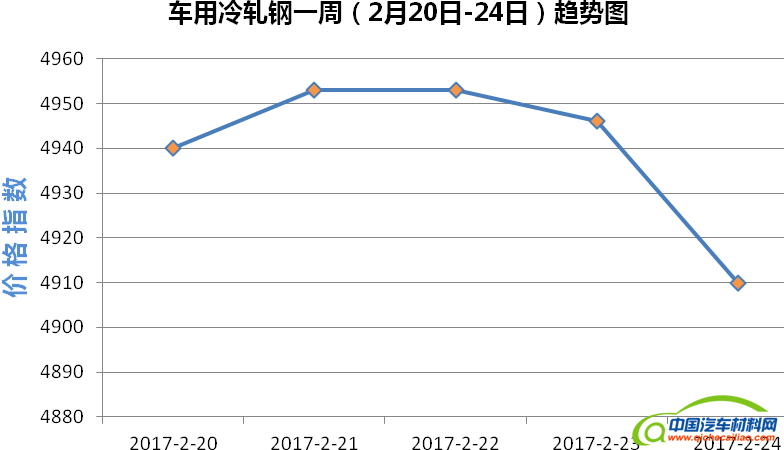 冷轧钢本周价格总体呈小幅下跌趋势,2月20日-21日价格小幅上涨;2月21日-24日价格下跌。本周冷轧钢平均价格指数为4940.4,较上周上涨0.19%,较1月份均价上涨2.07%。