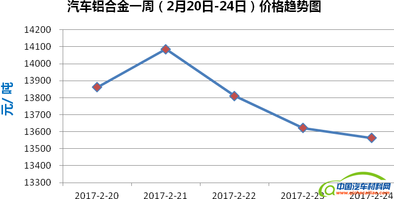 铝合金本周内价格呈下跌趋势,2月20日-21日,价格上涨224元/吨;2月21日-24日价格下跌,四日内跌幅达523元/吨。车用铝合金本周均价为13789元/吨,较上周下跌1.44%,较1月份均价上涨4.93%。