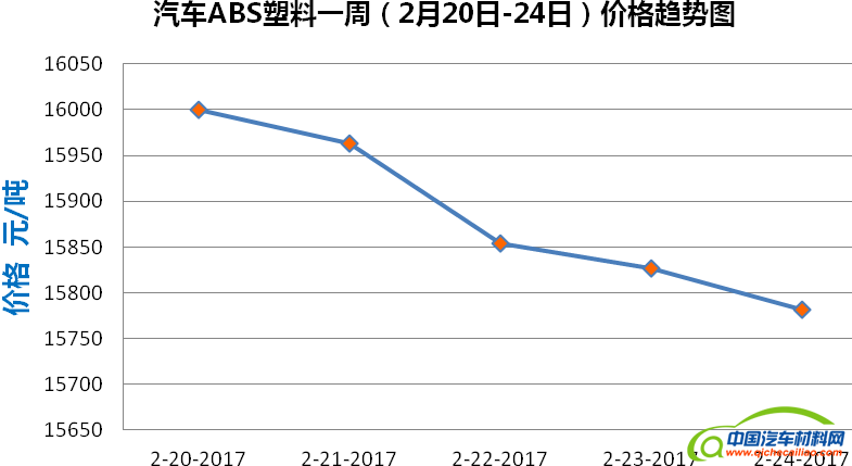ABS塑料本周呈快速下跌趋势,一周内跌幅达218.18元/吨,本周五价格跌至15781.82元/吨。车用ABS塑料本周均价为15885.45元/吨,较上周上涨1.99%,较1月份均价上涨6.81%。