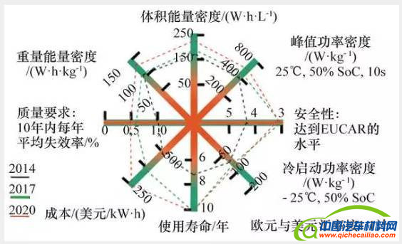 德国制定了国家电驱动平台计划,通过电池灯塔研发项目推动在动力电池领域建立单体电池及电池系统的生产能力,并提出了动力电池系统主要性能参数(2014—2020)(图3)。