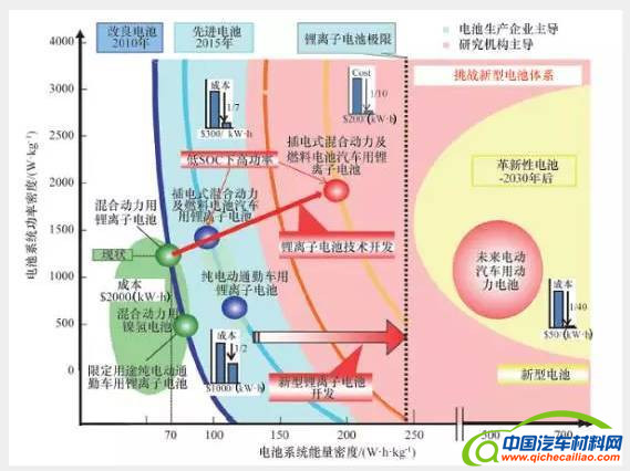 日本经济产业省的报告中提出了车用动力电池的功率密度、能量密度及成本的目标值(图2)。