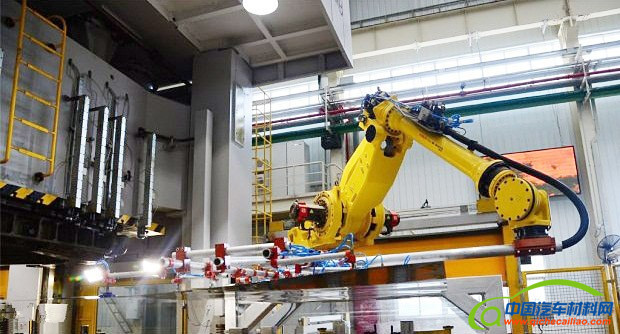 如图所示,在东风风行现代化生产基地,车门、车窗、车盖等车身零部件的冲压过程由巨大的机床完成,每道工序之间的搬运环节则由机器人完成。橘黄色机械手臂的手掌是真空吸附器,可以轻松吸附起巨大、不规则的车身部件,送到下一个冲压设备。冲压工序完成后,质检机器人开始工作,通过摄像头、激光等技术检测成品是否有瑕疵。在冲压车间现场,仅需少量工人负责监控或调整设备。高度自动化的冲压生产线,将尺寸误差降到最低,带来较高的良品率,并大幅提高生产节拍。“人工冲压汽车侧围件,一分钟只能冲压三四件,机器人能冲压六七件,而且不良率最高也只是人工冲压的1/10。”东风风行相关负责人说。