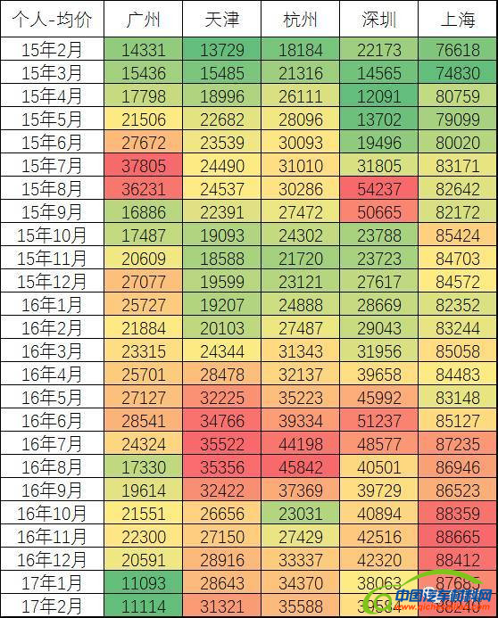 前期随着深圳房价暴涨,因此前几个月的个人拍牌价格偏高,但随着经济下行压力和单位用户购买力不足,个人拍牌价格也出现下调趋势。16年12月的广州价格下降到1.9万,相对去年7-8月的高价下跌较多。深圳也是暴跌一些,天津和杭州16年初较高点大幅下降,目前进入暴增期。随着今年的房价暴涨,需求心态不稳,7-8月汽车拍牌价格增长速度很快。目前天津和杭州的牌照拍牌价格创出新高,深圳处于次新高状态,有利于新能源车的销售。尤其是深圳16年的牌照价格暴增到5.1万,今年2月降到3.9万,拍牌的价格波动较大。近几个月的各城市拍牌价分化,上海的8.8万仍是还有些其他费用的,因此上海新能源车市场更火爆。