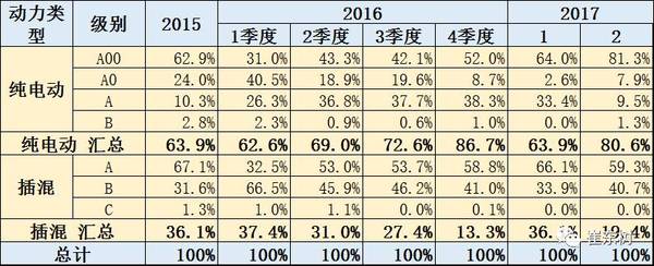 15年的纯电动车中的A00级车占比达63%,且A0级成为纯电动乘用车的绝对主力,这两类组合的经济型电动车成为主力。但16年2-4季度以来的A级电动车爆发增长到纯电动份额的37%左右。17年的A级电动车在上半年仍有北京市场的巨大释放潜力,2月的占比稍低,还有较大增长潜力。