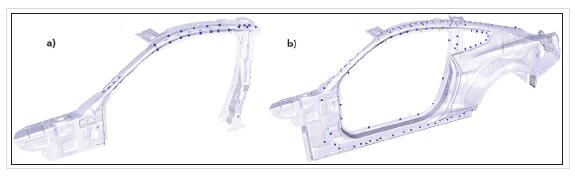 RLSK焊接头连接起车体侧身内组件上34处远程激光结构焊点,其中包括层叠厚度达2 毫米(图3a)的结构焊点。它们采用缝焊及摆动C焊从而在厚层叠焊点上达到出色的熔深值。此外,车体侧身外组件也采用远程激光焊接:Coupe车型有79个焊点,Convertible车型则有61个焊点(图3b)。0.7毫米厚低碳热镀锌钢(HDGI)车体侧身外组件与各种不同厚度、材质的车体侧身内组件相焊接,并采用G 型焊接设计以提高其质量的稳定性和稳健性。