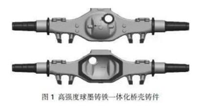 图1为一汽集团开发的一体化桥壳,用以代替焊接桥壳及带半轴套管铸造桥壳的新产品,实现铸件的集成化铸造,充分利用铸造成形的优势。目前常见的铸造整体式桥壳的主要形式是在桥壳的两端压入无缝钢管作为半轴套管,并用销钉固定形成桥壳总成。为进一步提高桥壳的强度、刚度和简化工艺过程,一汽集团开发出了直接在桥壳上铸出半轴套管(图1桥壳两侧的部分)的一体化桥壳,其特点是减少加工难度,成本降低较多,桥壳结构趋于简单,且桥壳刚性较好,可制成复杂而理想的形状,壁厚能够变化,可得到理想的应力分布,其强度及刚度均较大,工作可靠。由于集成了半轴套管,铸件尺寸显著增加,铸件长2 258 mm,其单件重量超过200 kg。针对这一集成铸件的特点,企业建立了专用生产线用以保证生产。