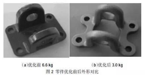 图2 是东风精密铸造有限公司对商用车支座进行优化设计前后的铸件外形对比,可见铸件初始重量为6.6 kg,其设计为典型的等厚设计。该铸件经过加筋、挖孔和变截面等一系列轻量化设计方法后,铸件重量变为3.0 kg,减重效果可达50%以上。