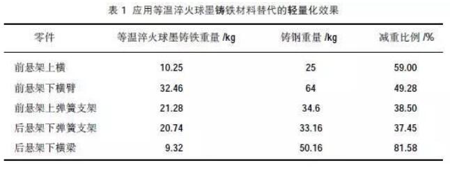 并针对等温淬火球墨铸铁件高强度特点,对14个悬架类零件进专家论坛行重新设计。表1为采用等温淬火球墨铸铁材料替代后的轻量化效果,总重量减轻近40%,效果显著。需要说明的是表1 中的轻量化效果不仅仅是材料替代产生的,还包括轻量化设计的贡献。一般来说,汽车铸件的材料替换往往伴随着零件的轻量化设计。